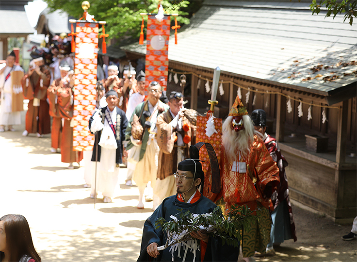 数々の宝物の中でも国の指定を受ける5点『赤糸威鎧』『円文螺鈿鏡鞍』『紫裾濃甲冑』『宝寿丸黒漆鞘太刀』『鍍金長覆輪太刀』は、当社にとって重要な意味を持つ宝物で、例祭「日の出祭」には必ず奉持され欠くことの出来ない御神宝として大切に保存されてきた背景があります。