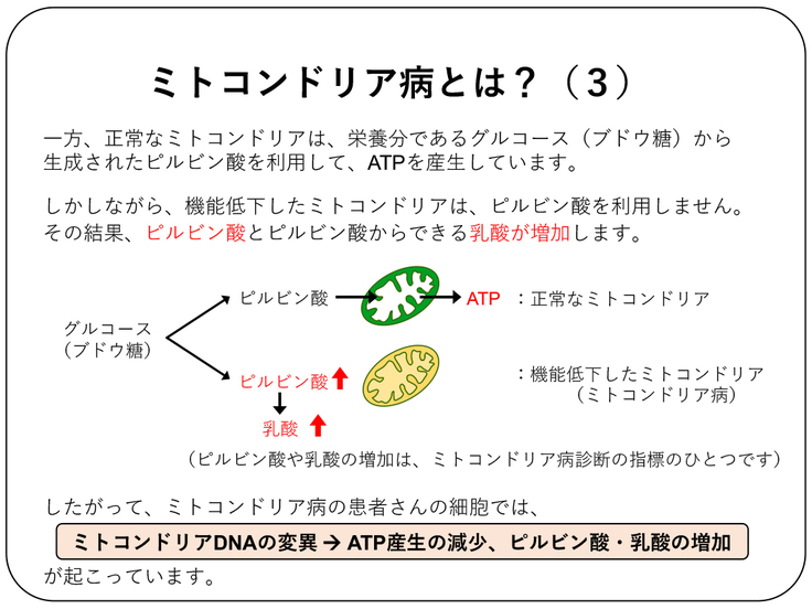 ●したがって、ミトコンドリア病の患者さんの細胞では、「ミトコンドリアDNAの変異」の結果、「ATP産生の減少、ピルビン酸・乳酸の増加」が起こっています。