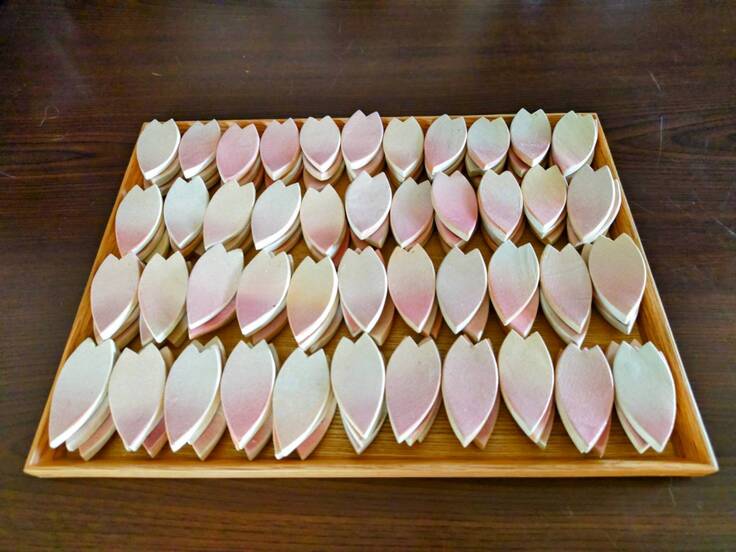 さて、当プロジェクトを大きくけん引してくれた金子窯様の桜箸置きですが、既製品ではなく、正真正銘全て手作りです。そのため色の入り方、グラデーション、艶感等々が340個全て違います。
