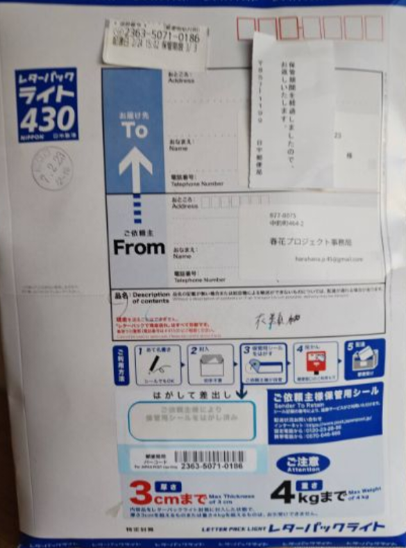 先日お送りしたレターパックが一点「保管期限超過」を理由に戻ってきております。リターン送付にレターパックやクリックポストを利用している理由は、日本全国一律料金であること、荷物の追跡ができること、そして、受け取り不要で、ポスト投函されるからです。どのような理由でポスト投函されず、郵便局の保管期限をも過ぎて、手元に戻されたのかは、私たちでは分かりません💦