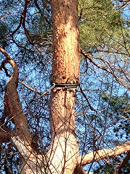 特に建物の近くにあるこれらの樹については樹高を抑えるための剪定をした後、今後の倒木防止抑制のためのワイヤー支柱が取り付けられました。