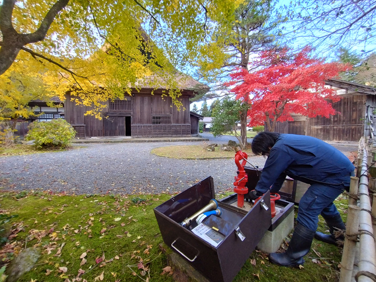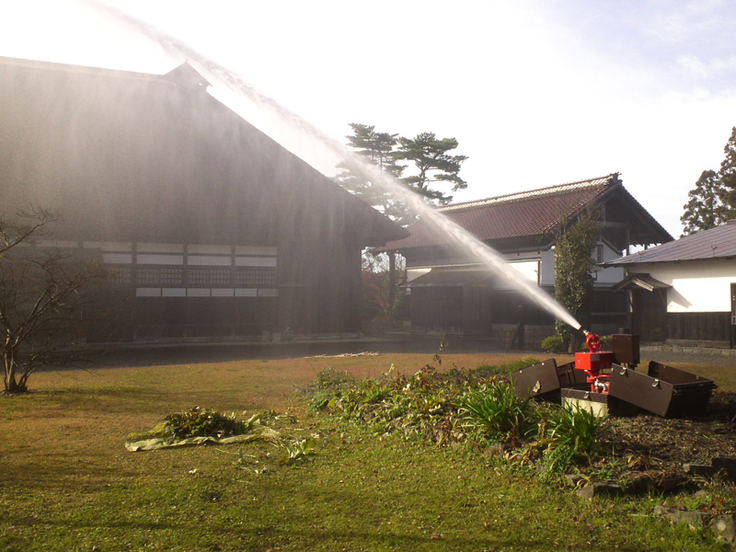 屋敷内には放水銃5基、消火栓3基を備え、主屋の自動火災通報設備・各建物には煙感知器や消火器などを設置し防災防火に努めています。