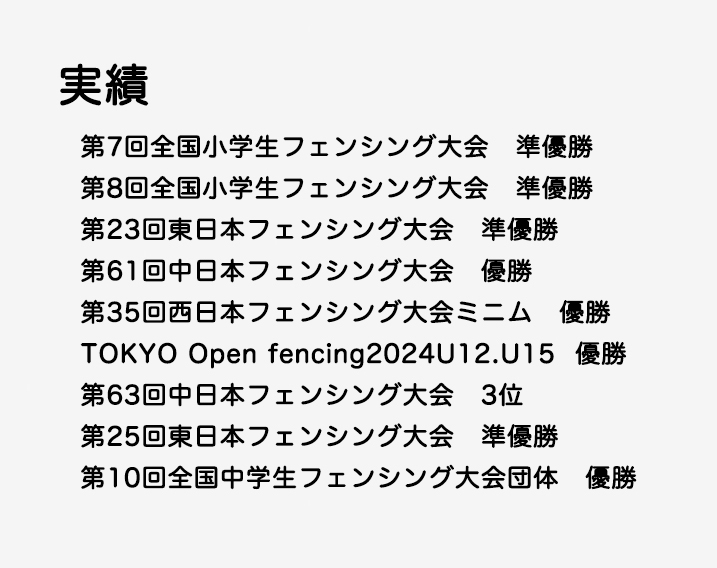小学1年生の時にフェンシングに出会い世界で活躍できる選手になれるよう活動しています。