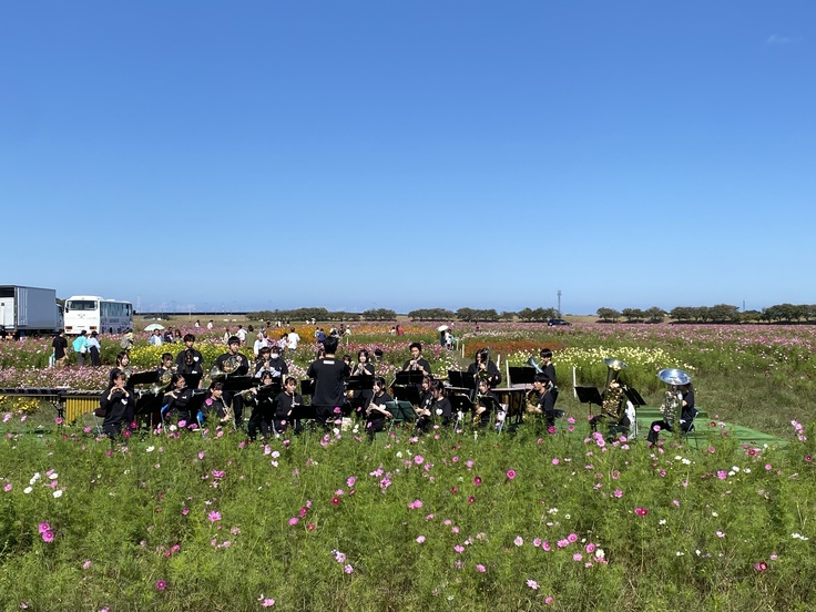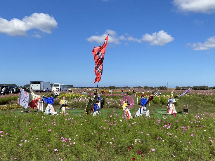 お天気にも恵まれ、コスモス畑の中でYOSAKOIと啓新高等学校「吹奏楽部」の発表に、会場は感動に満ち溢れました。また恐竜から風船プレゼントもありました。