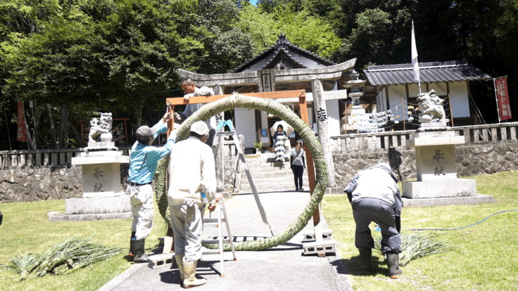 茅の輪づくり | 夏越の大祓当日の早朝、総代の皆さまと茅の輪を作成し、その様子を動画で配信しました。 |