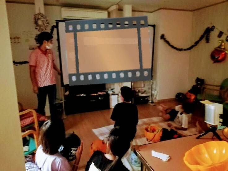 午前中はハロウィンの時期に合わせて、ハロウィンパーティを行い、お昼から映画を上映します。