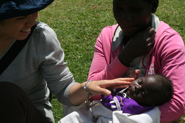 この日は、新生児の健診をするということで、新生児とお母さんが集まってくれていました。おでこに花びらを載せると、しゃっくりが止るという迷信があるそうな。