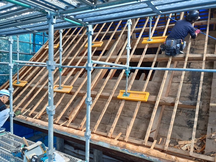 素屋根が組まれ、杮葺きの屋根をはがしました。