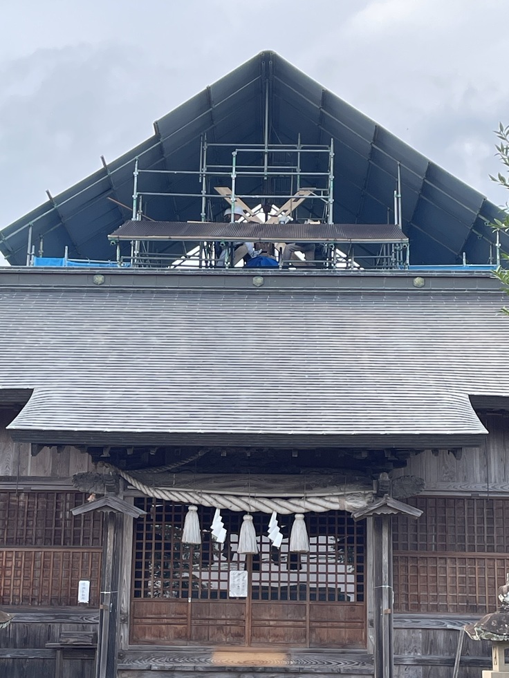 失われていた千木の修復も順調に進んでいます。今後、本殿屋根の銅板葺き工事を行う予定です。