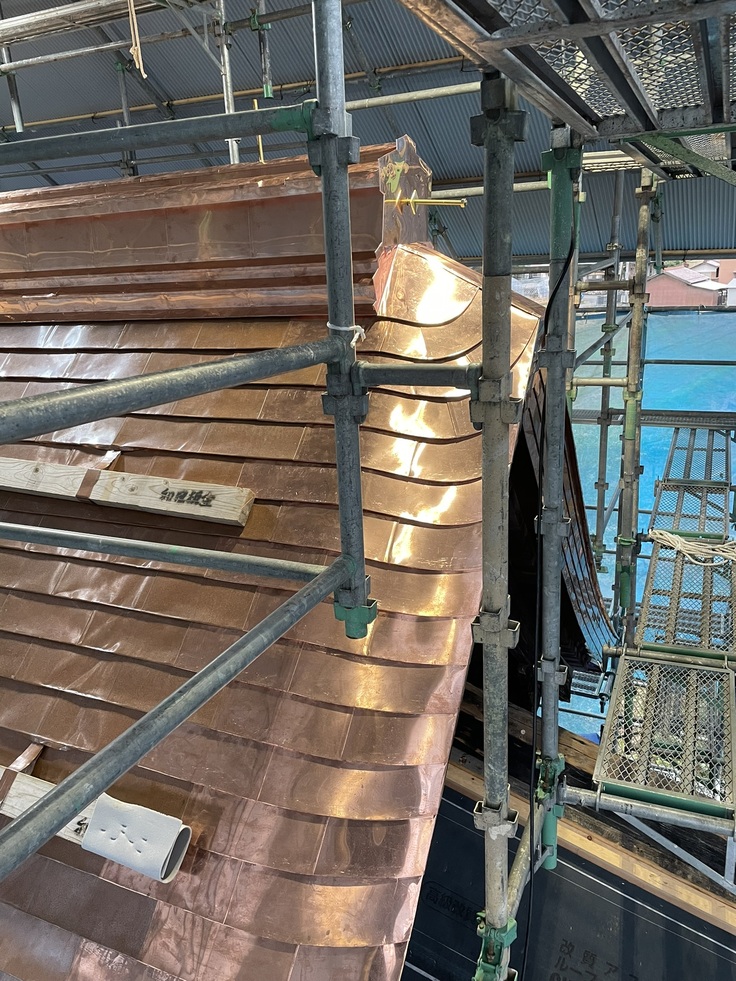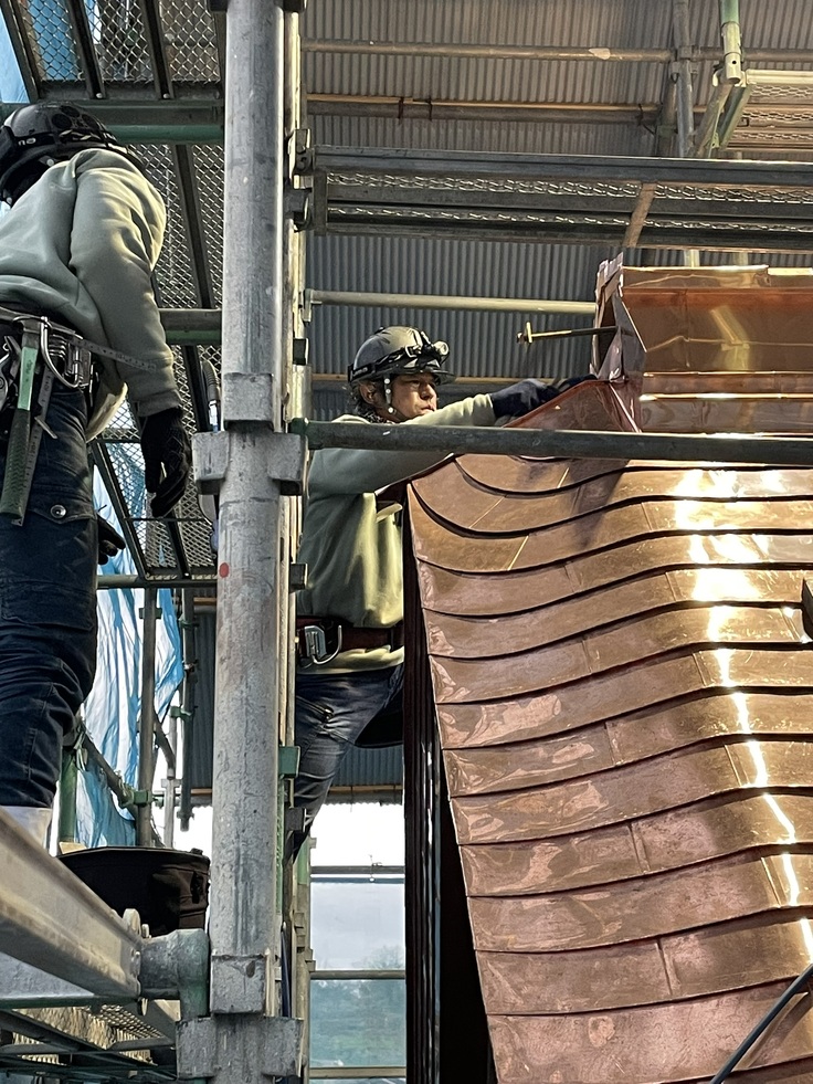 本殿屋根葺替えにつきましても冬季の不安定な天候の中、職人の方々のご尽力で順調に進んでおります。