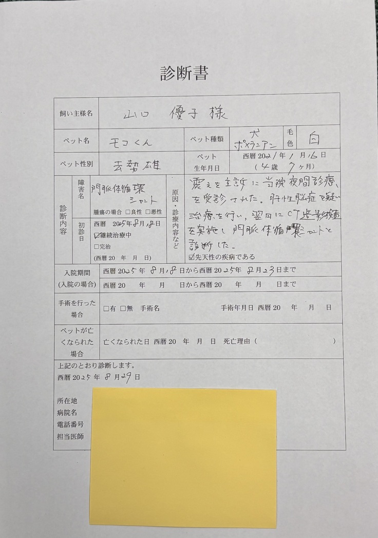 先天性門脈体循環シャントに間違いないと思いますとのことでした。