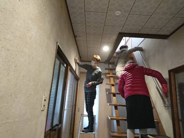 そして昨日、メンバーが集まって、玄関ホールの壁塗り準備。