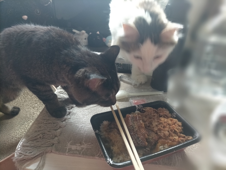 先日、鰻牛を食べていたら、珍しくモカとトラが2人でやってきてクンクン匂いを嗅ぎまくっていました!!😸