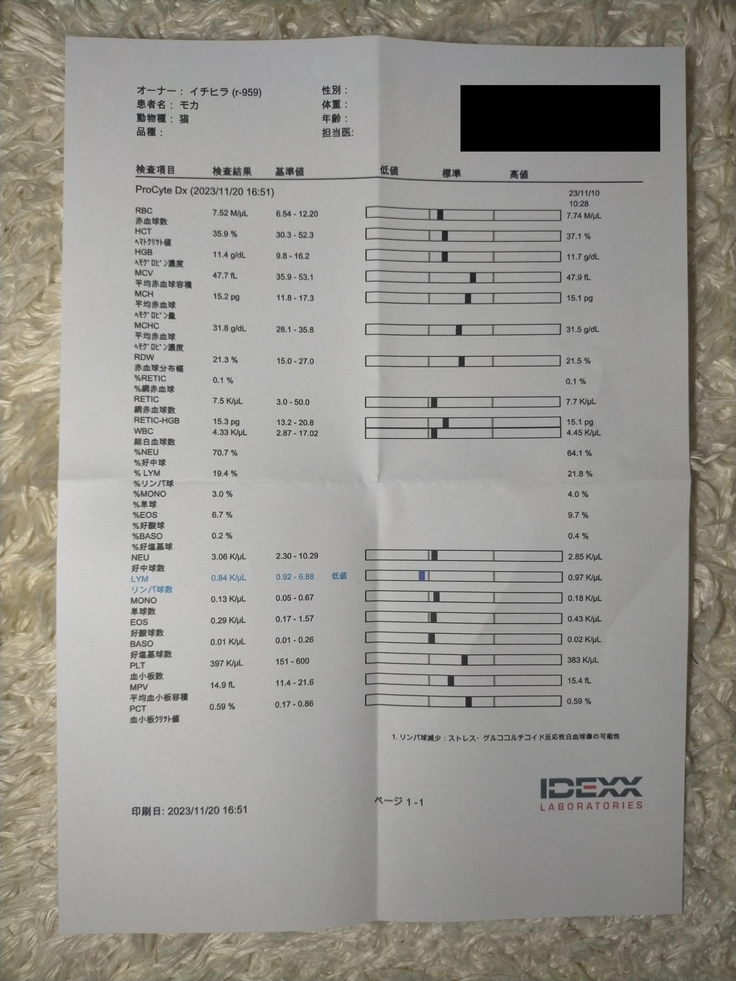腫瘍らしき病変は全く見受けられず、全体の白血球数は少々下がってはいるものの(逆に上がっているとリンパ腫的には炎症が起きていることになるので良くない💦)総合的には全て平均値内で、非常に優秀な成績を収めることができました!!👏