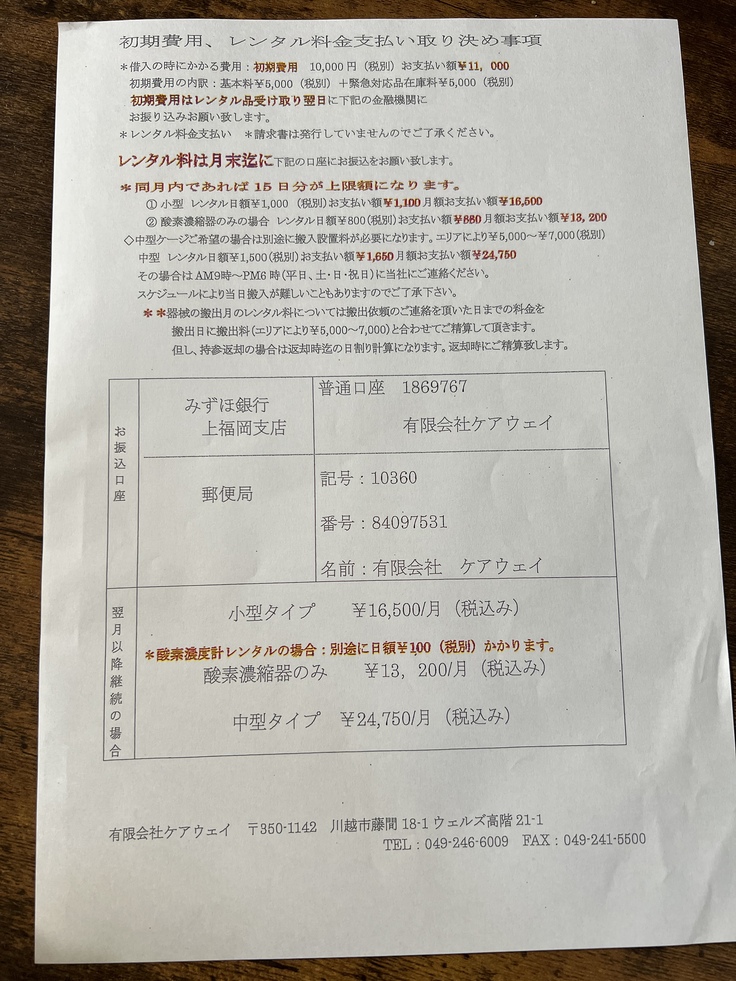 【酸素ケースのレンタル料】