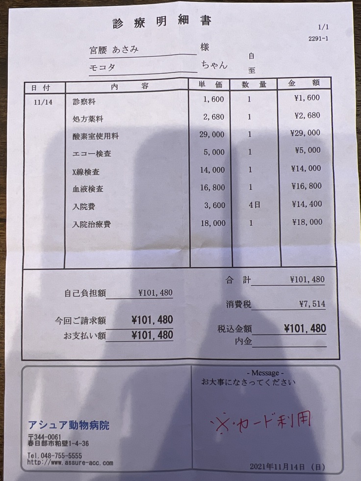 モコタの状態を説明したら、肺水腫の可能性もあって、肺水腫だと今夜もたないかもしれないから大事をとるなら念のために夜間救急にかかったほうが安心と説明してくださいました。家から車で50分ほどの夜間救急へ行くことにしました。