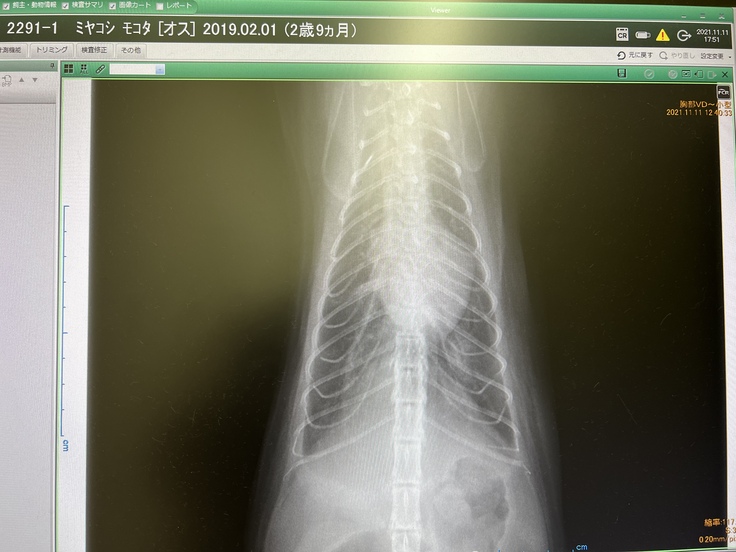 心臓は胸郭との比率でみて74%ほど肥大していると言われました。本来は60%が理想です。