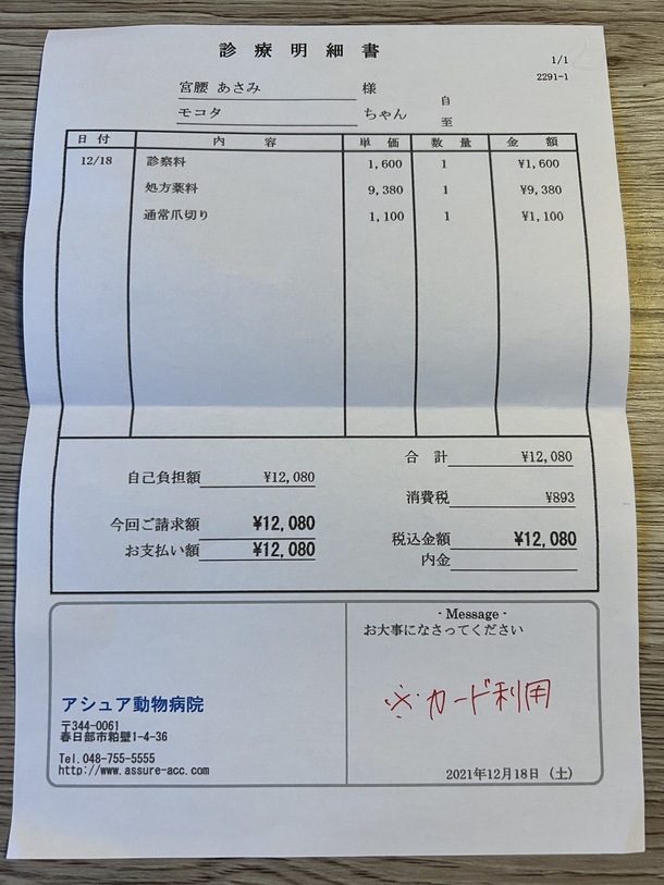 12月通院 治療費明細書