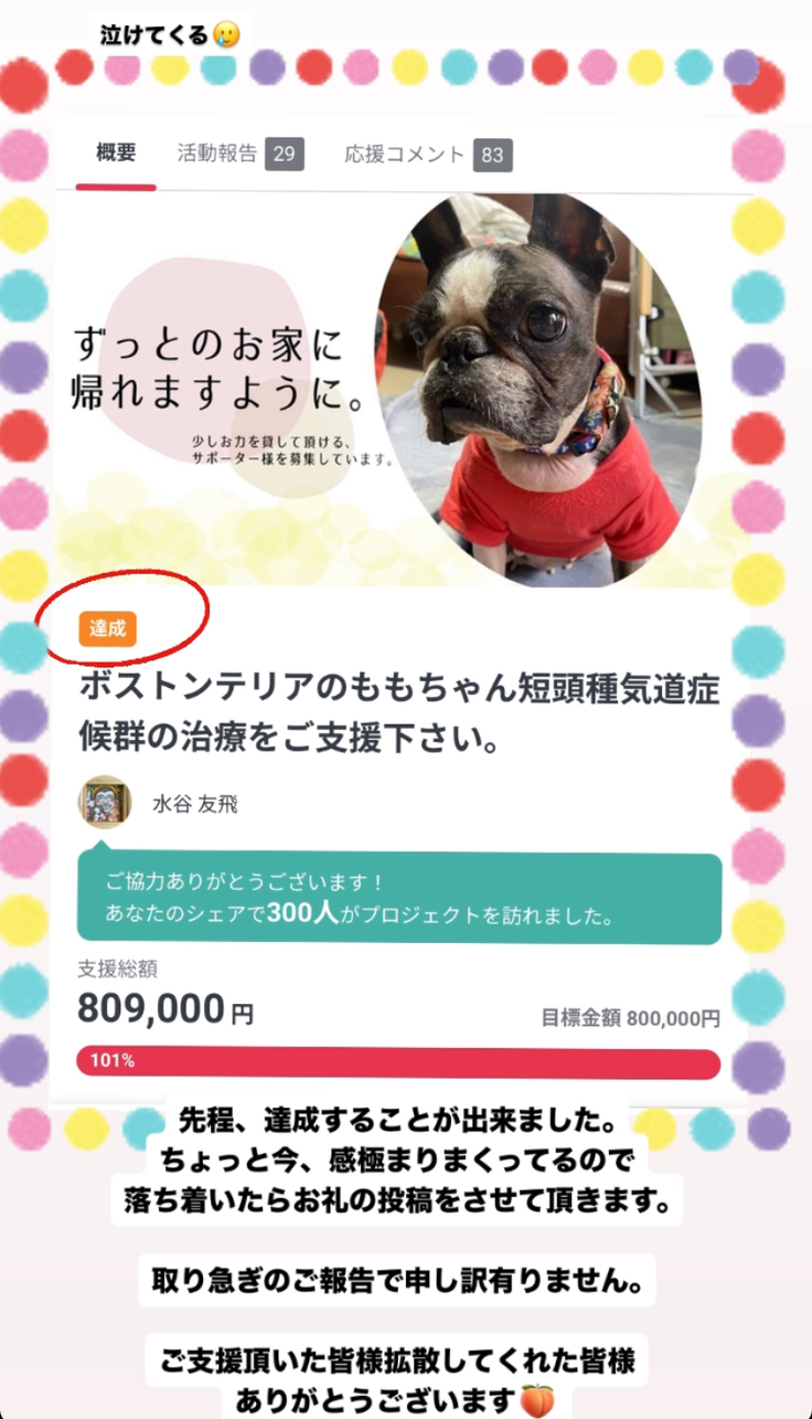 ボストンテリアのももちゃん短頭種気道症候群の治療をご支援下さい。