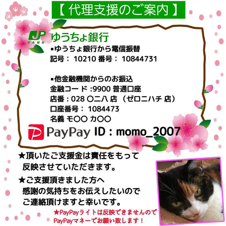 厚かましいお願いで大変心苦しくはございますが、どうかモモのために皆様のお力添えをよろしくお願いいたします。