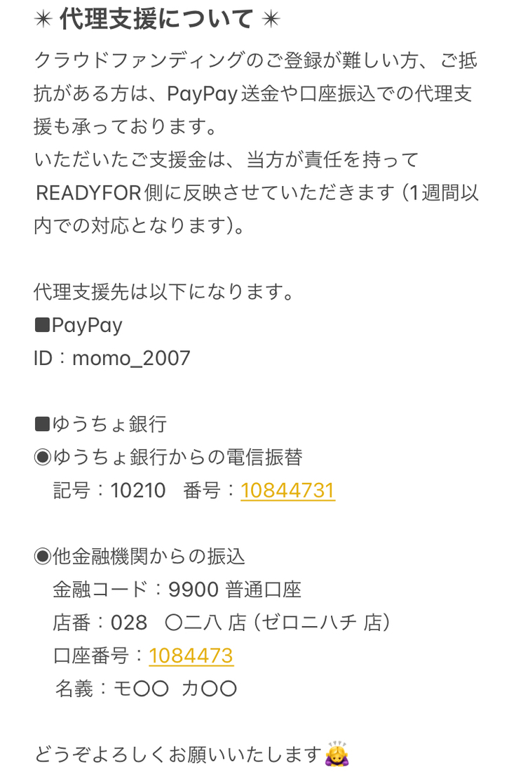 ※「代理支援」よりいただいたご支援金は、当方が責任を持ってREADYFOR側に反映させていただきます