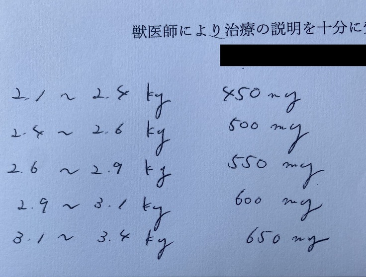 主治医より、百太郎は成長期のオス猫のため、治療後半はもっと薬の量が増えることになると説明を受けています。実際、開始から10日の間に内服量が100mg増えています。