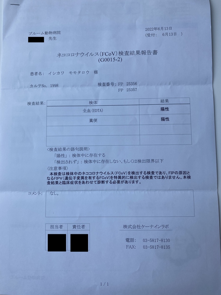 先生より、確信は持てないがFIPドライタイプを疑うとのお話、根本治療が難しい為これまでのような対処療法を行うことしかできない旨の説明を受ける