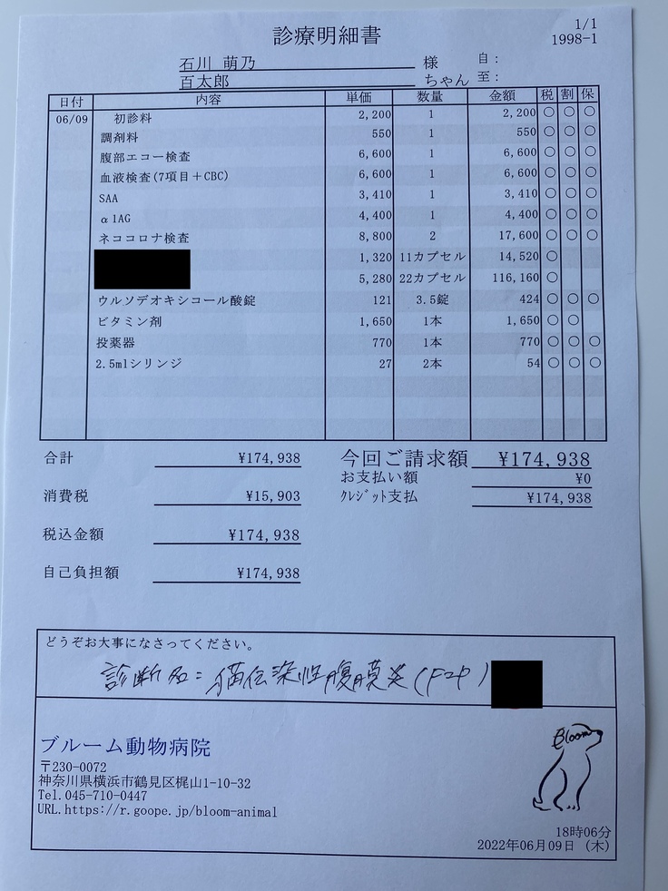 先述の通り、FIPは致死率の高い病気であるのに対し、絶対的な治療方法や薬は未だ開発されていません。そのため、ごく一部の協力病院でのみ可能なペット保険の利かない非常に高額な未承認薬を使用して寛解を目指すことになります。