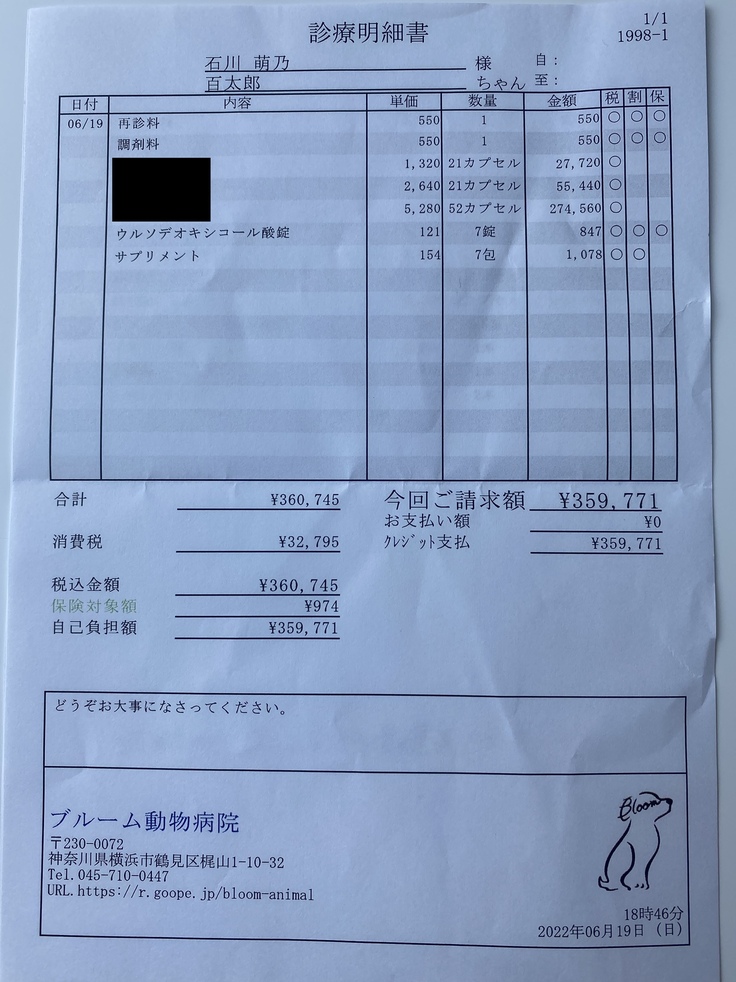 ↓この日の診療明細(主治医名を載せない条件で掲載許可をいただいています)