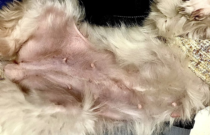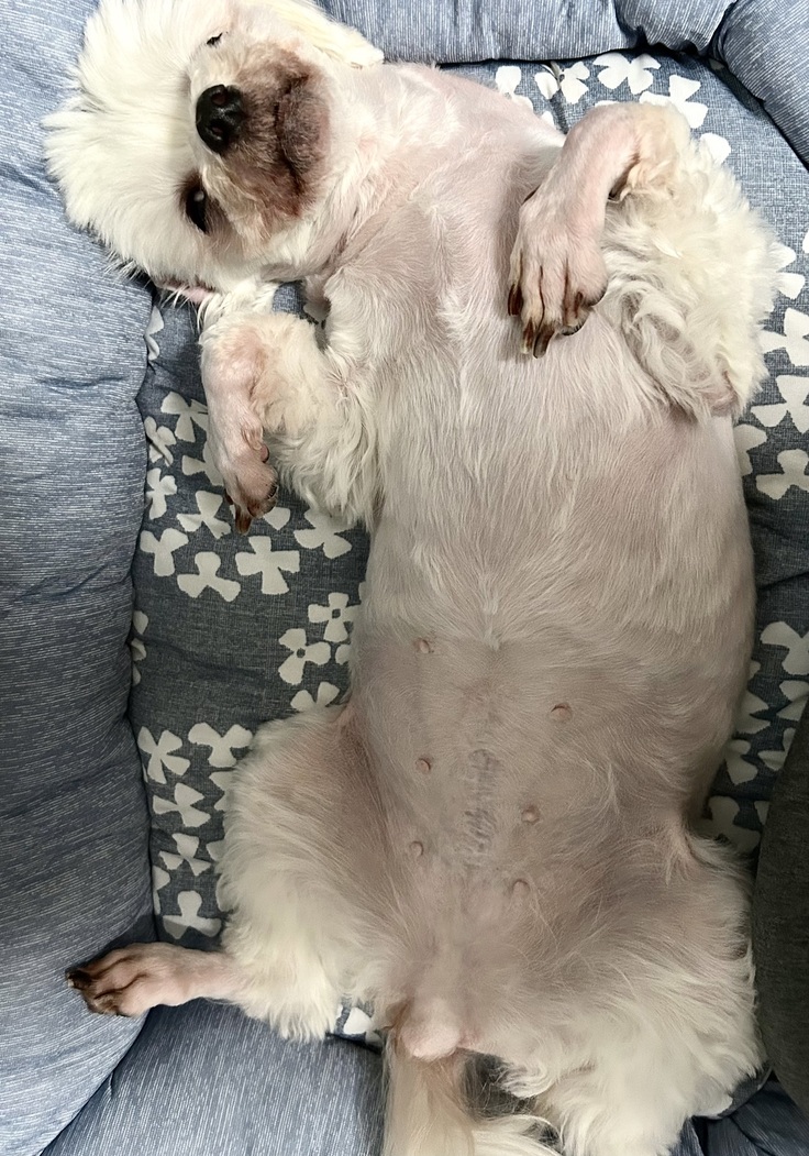 もも子のお腹にはシコリや大きな傷跡が何重にもあり、乳頭の位置は左右ちぐはぐでした。 避妊手術の際に獣医さんは、繰り返し帝王切開をした為に切開部分が硬かった事、内臓と腹部の皮が癒着していて、剥離をしたりと手術が大変だったとおっしゃられていました。