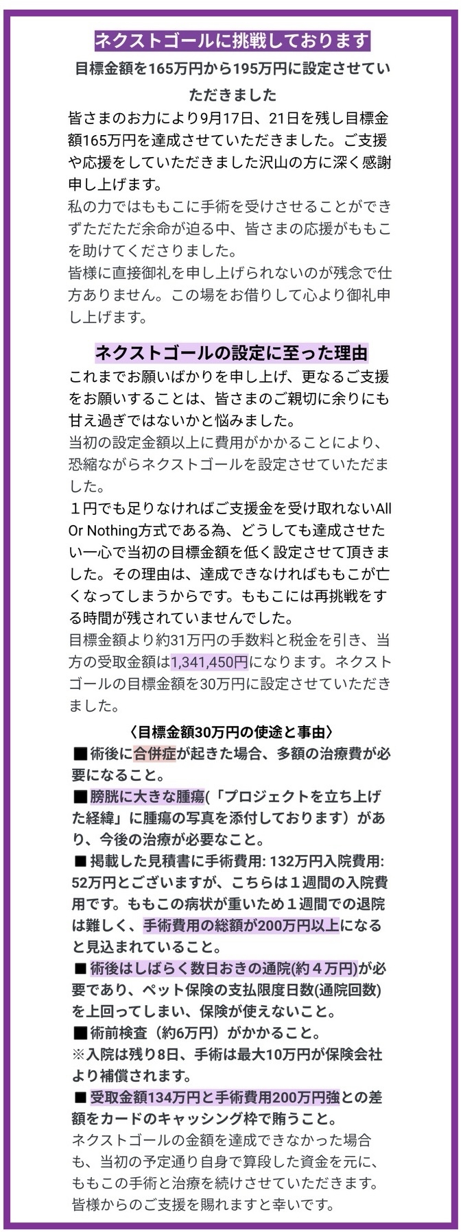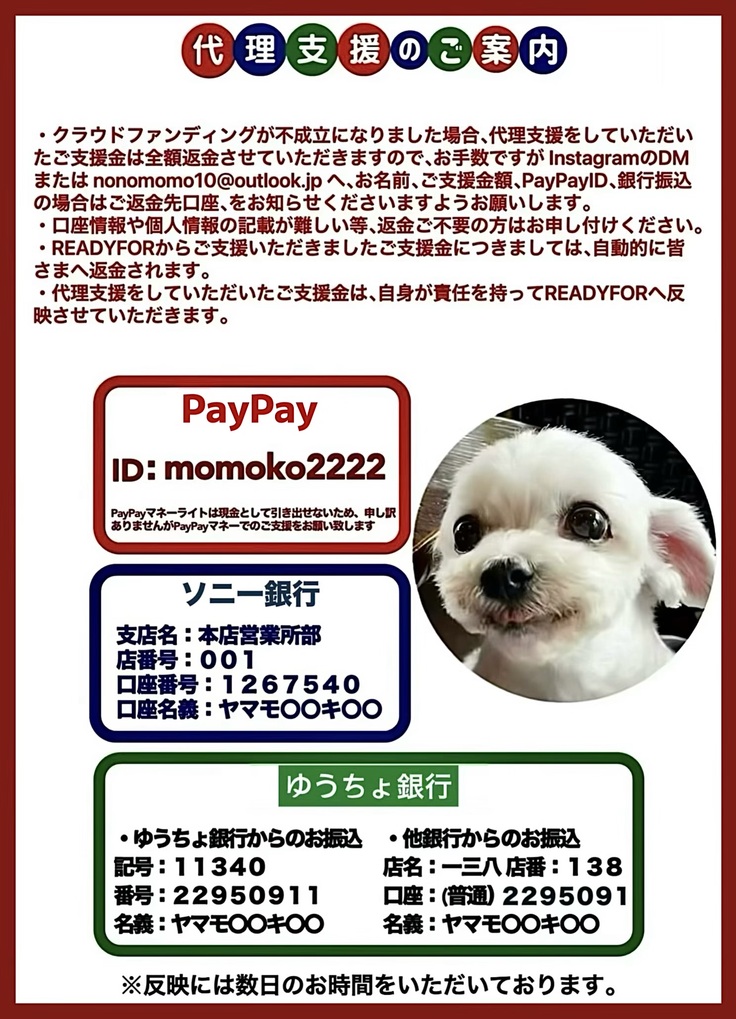 万が一、ももこが亡くなってしまった場合、いただいた支援金については、返金はせずこれまでの治療費に当てさせていただきます。