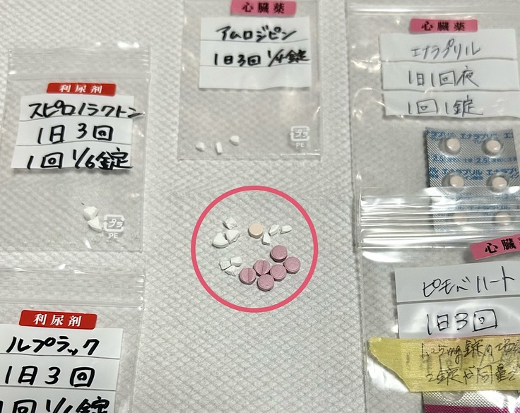 以前は3種類のお薬を1日2回飲んでいましたが、今は5種になり、1種類を除いて1日3回飲んでいます。