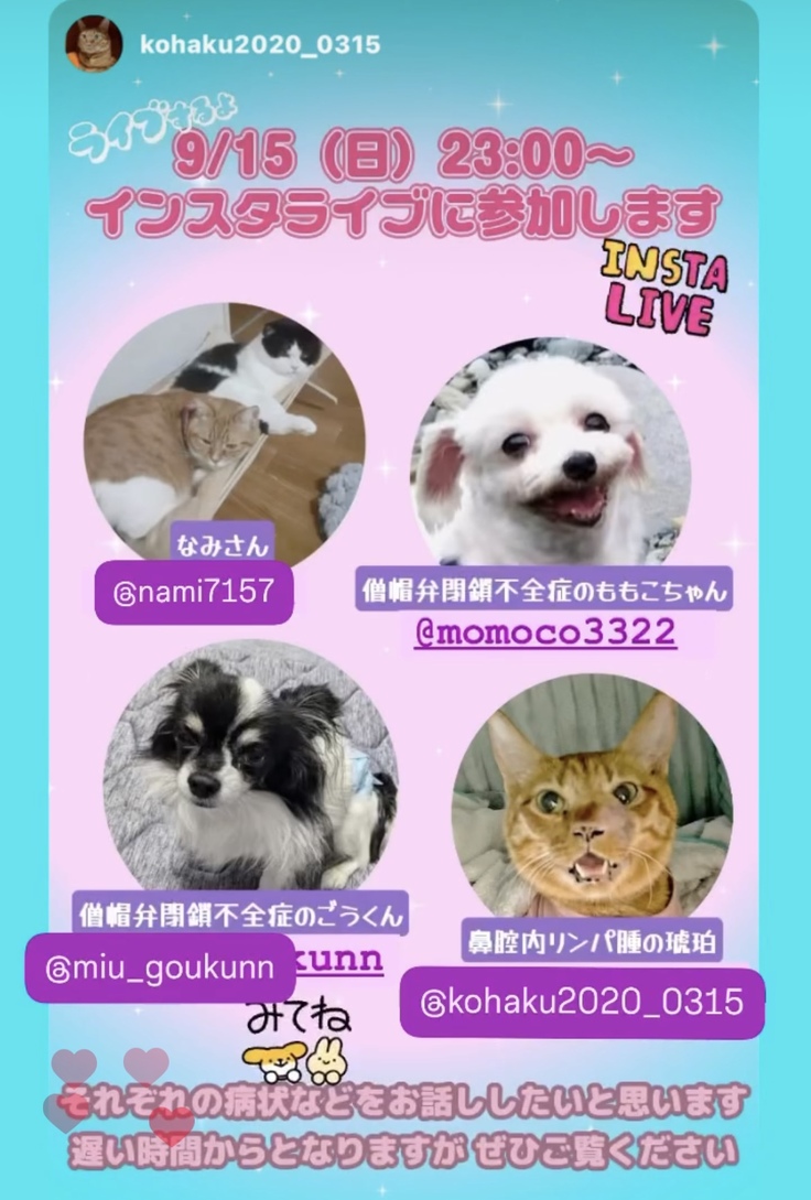 わたくし事ですが、今夜23時よりインスタグラムにてコラボライブに参加させていただきます。普段のももこの様子をご覧いただけますと嬉しいです。病気の猫ちゃんワンちゃんとご一緒させていただきます。