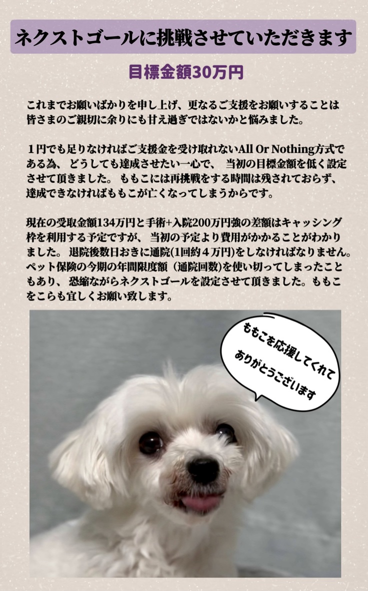術後の合併症に備えなければいけないことや、ペット保険の今期の年間限度額(通院回数)を使い切ってしまったこともあり、恐縮ながらネクストゴールを設定させて頂きました。ももこをこらも宜しくお願い致します。