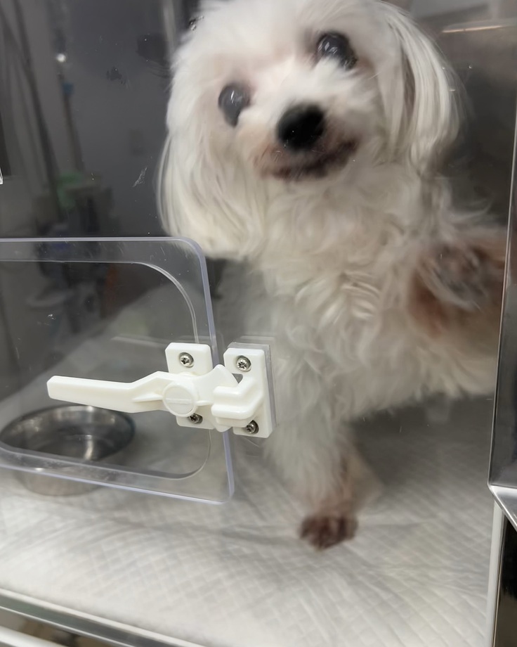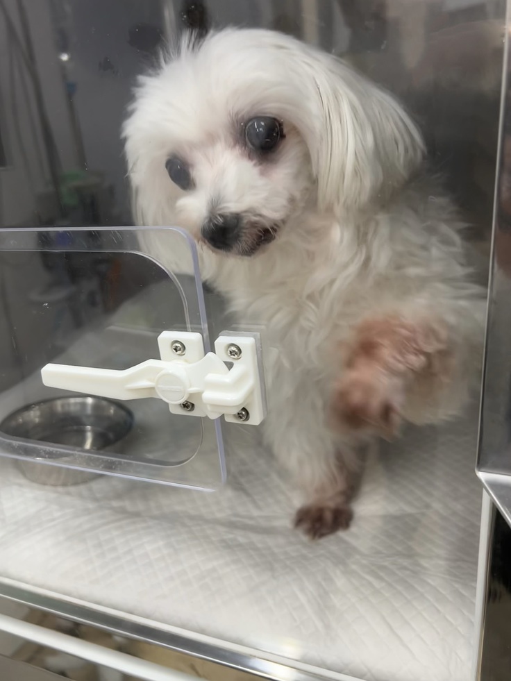 私の顔を見るや否やここから出してと言わんばかりに、ドアを引っ掻いていました。私が来るまでは寝ていたようで、そのまま寝かせてやれば良かったと後悔しました。興奮してしまい心臓に良くないので、名残惜しいですが1分ほどで入院室を出ました。