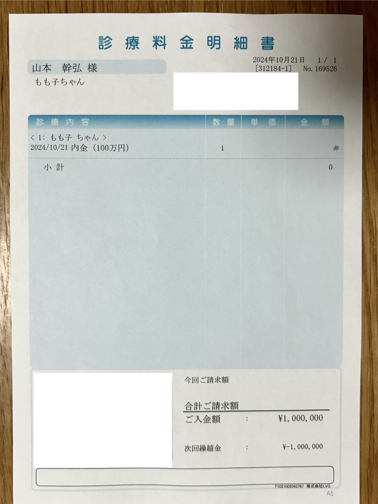その後同意書に記入をし、半額の100万円を支払いました。以前の病院は手術の1週間前に全額でしたが、こちらでは入院時と退院時に半分ずつ精算します。