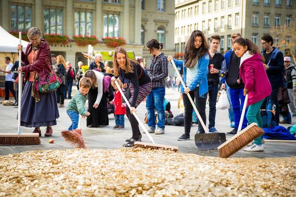 エノさんたちは、ベーシックインカムの国民投票運動の中のパフォーマンスとして、すべての人に平等にお金がいきわたるようにスイスの人口800万人にあわせ800万枚、5000万円分の5セントコインを、連邦議会とスイス銀行の前の路上に置き、パフォーマンスを行いました。