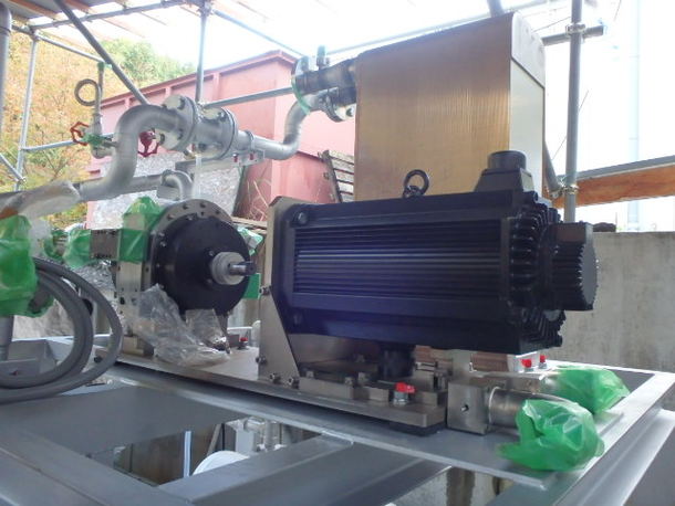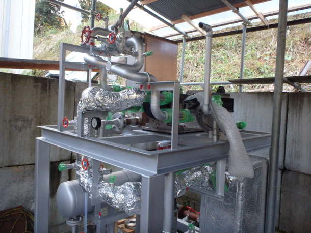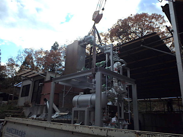 先日搬入された発電システムの心臓部である「ロータリー式バイナリー発電機」を所定の位置に移動し設置しました。これから、燃焼器と温水器と発電機をつなぐ配管工事の準備に取りかかります。