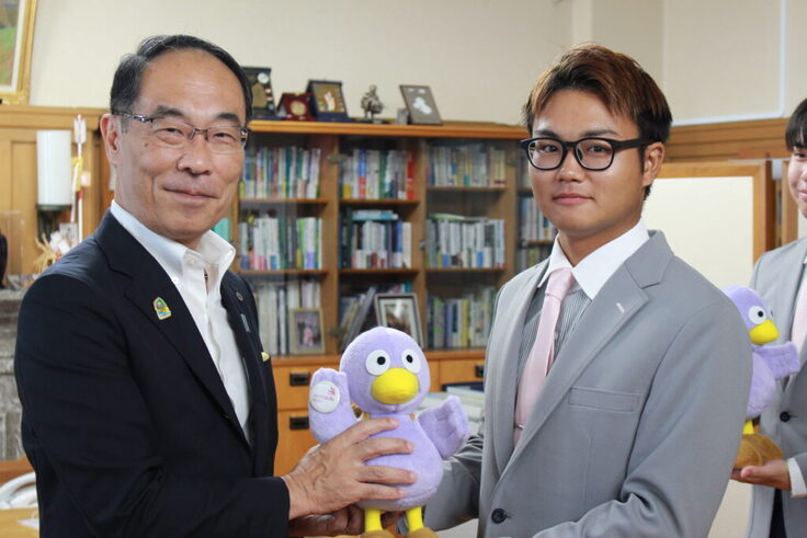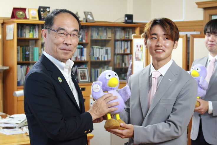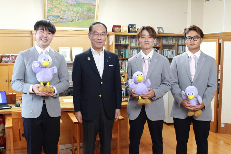 大野知事に競技内容の説明を行い、大会への抱負をお伝えした後、大野知事から激励のお言葉をいただくとともに記念品を贈呈いただきました。