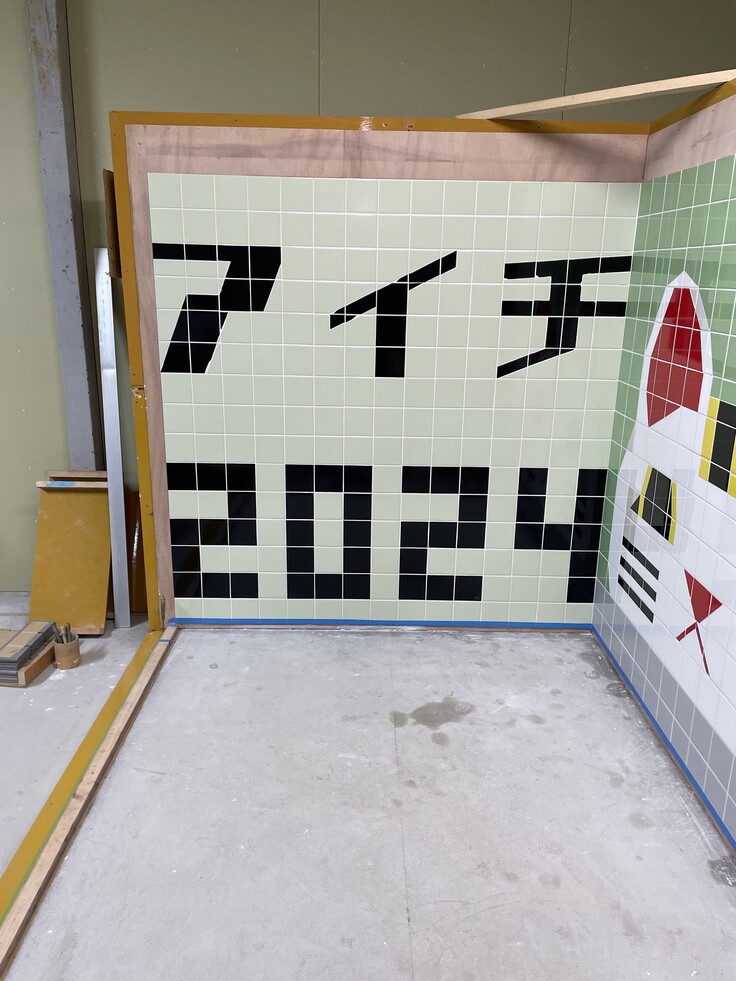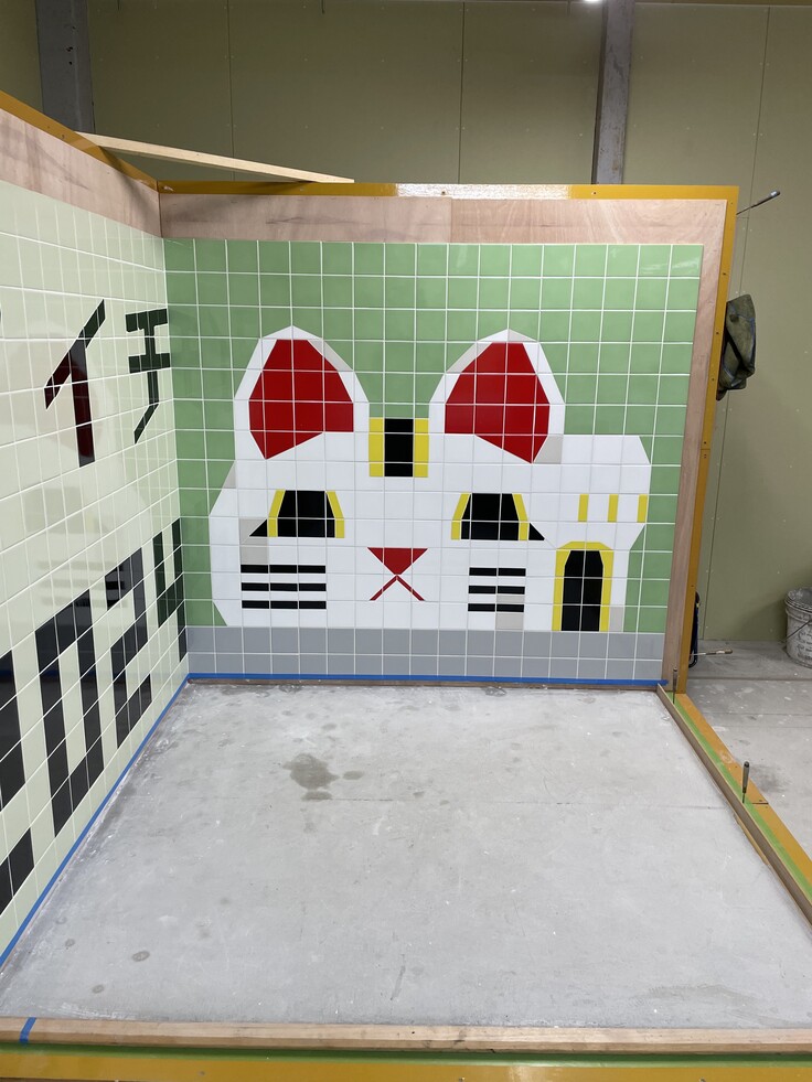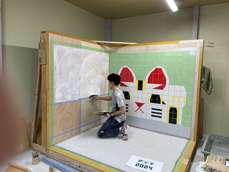 壁2面、床一面を正確な寸法で丁寧に仕上げます。切断する際のタイルへの墨出し作業、切断作業そのものが出来栄えの良し悪しを左右します。川田選手は、作業時間や精度はすでに完成していますが、細心の注意を払い、ミスが無いように最後のチェックを入念に行っています。