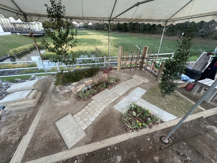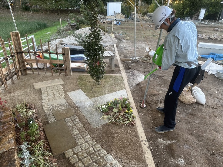 今泉選手は、大きなスペースを使用して、中木・低木・草花を配置するために、石積みや、延段、芝生張りを行っています。出来栄えと寸法精度を最優先して作業を進めています。