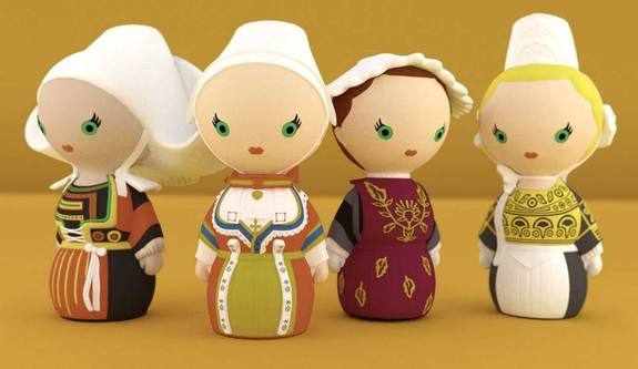 これは「こけし」です。こけしは日本の物ですって皆さんは考えてるですよね。そうです!でも、ブルターニュでも作ってます!全て手作りで作られていて、ブルターニュのこけしは昔の民族服の人形です。