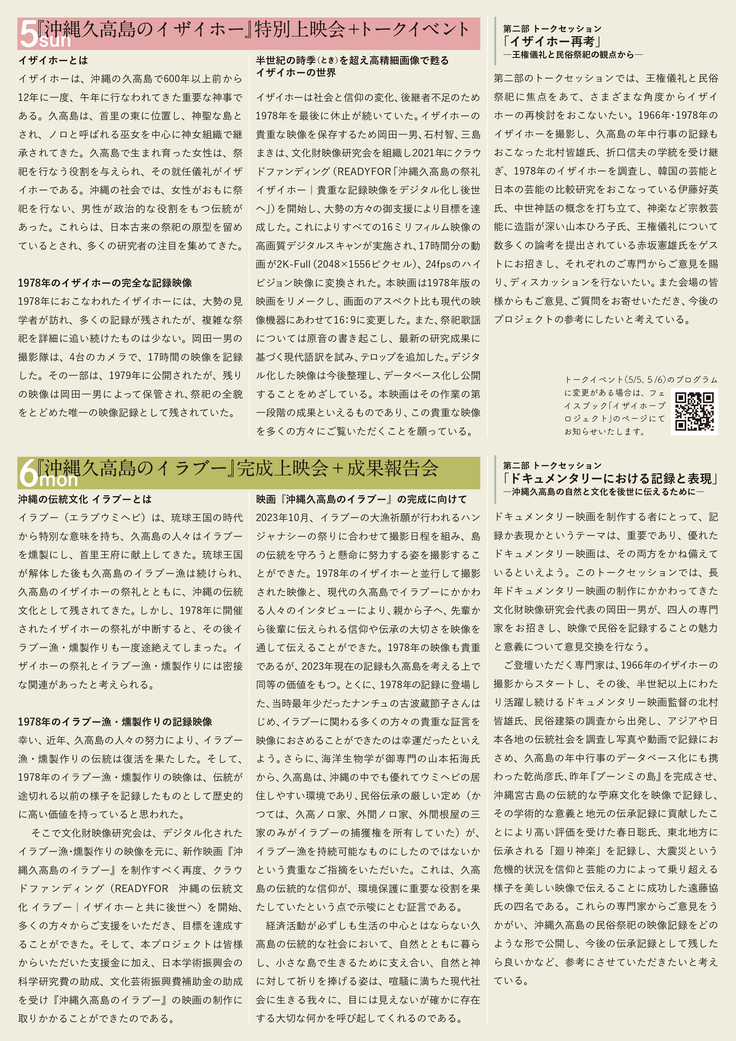 そこで関連イベントとして、今年5月5日(日)には『沖縄久高島のイザイホー』特別上映会・トークイベント、5月6日(月・振替休日)には『沖縄久高島のイラブー』完成上映会・報告会を、いずれも新宿の紀伊國屋ホールで開催いたします。