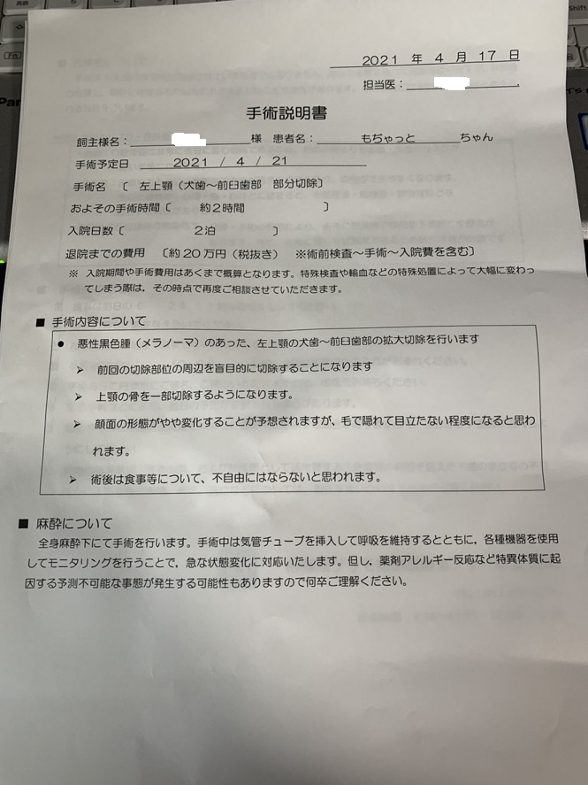 手術当日は ずっと最初から見てくださっている G先生と 院長、 そのほか大事な外科手術の際に来ていただく 外部のエキスパートな先生のグループでもっぷの手術に臨んでくれることとなりました。