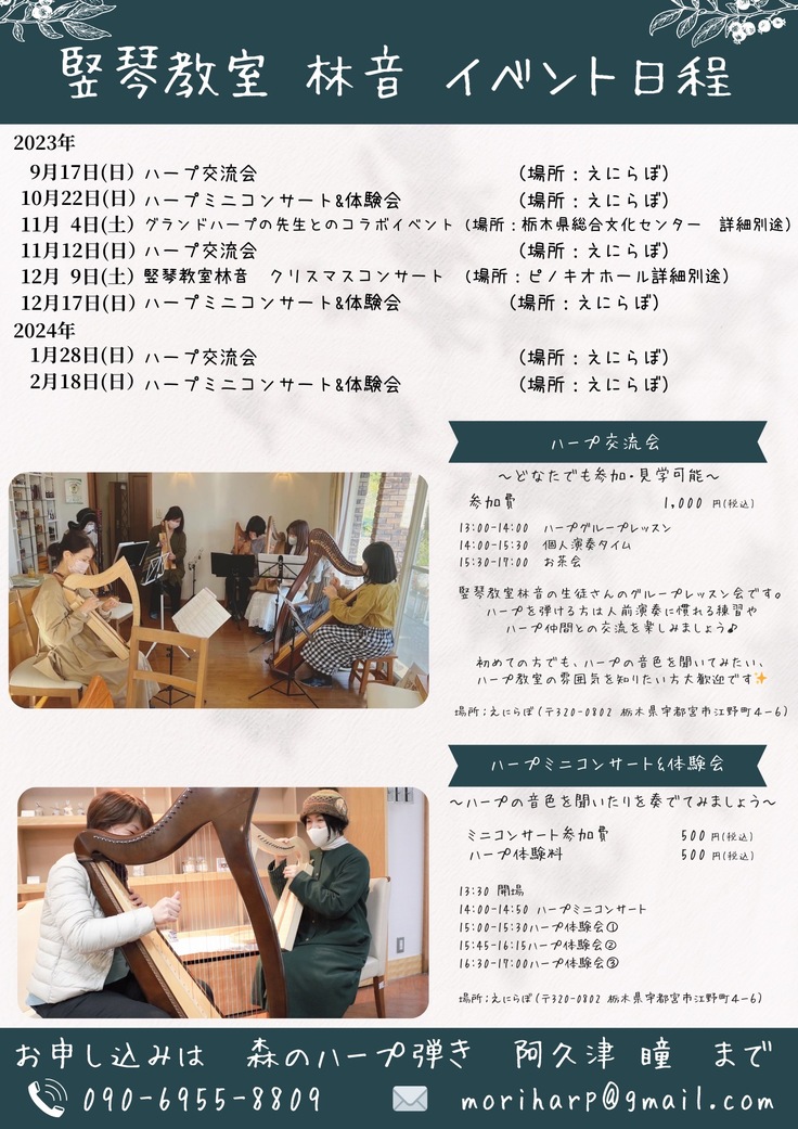 これからのハープ関連のイベントのお知らせです。