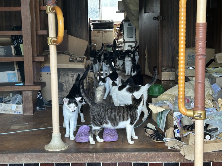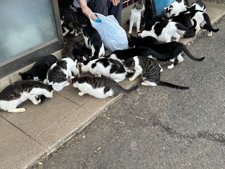 ねこたちにごはんをあげながら、ぽつりぽつりとお話しをしてくださる家主さん。