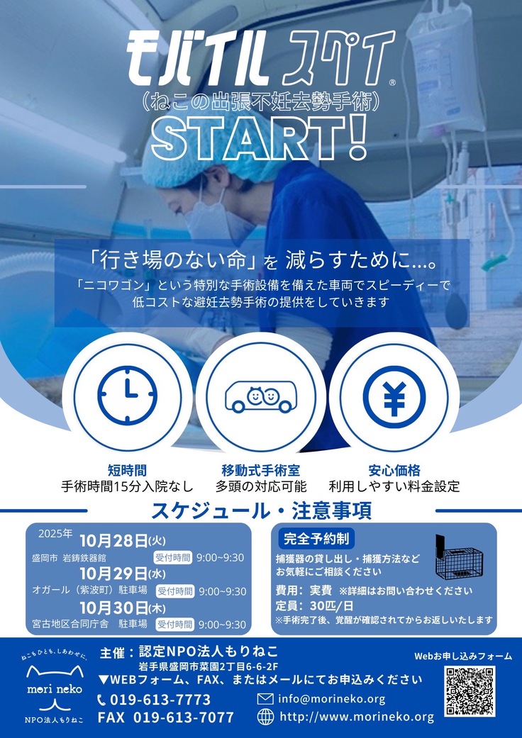 岐阜県が拠点のにじのはしスペイクリニックさんにご協力いただき、岩手のねこたちのために出張避妊去勢手術の定期開催をスタートいたしました。