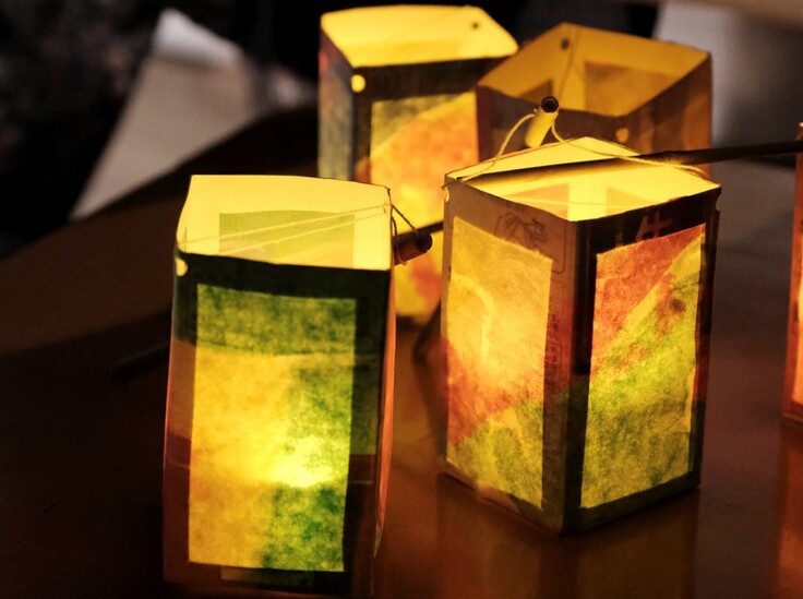 子ども達が染めた和紙に牛乳パックで枠を作り