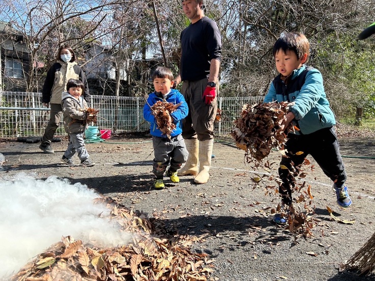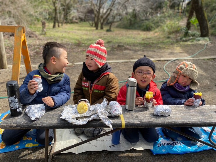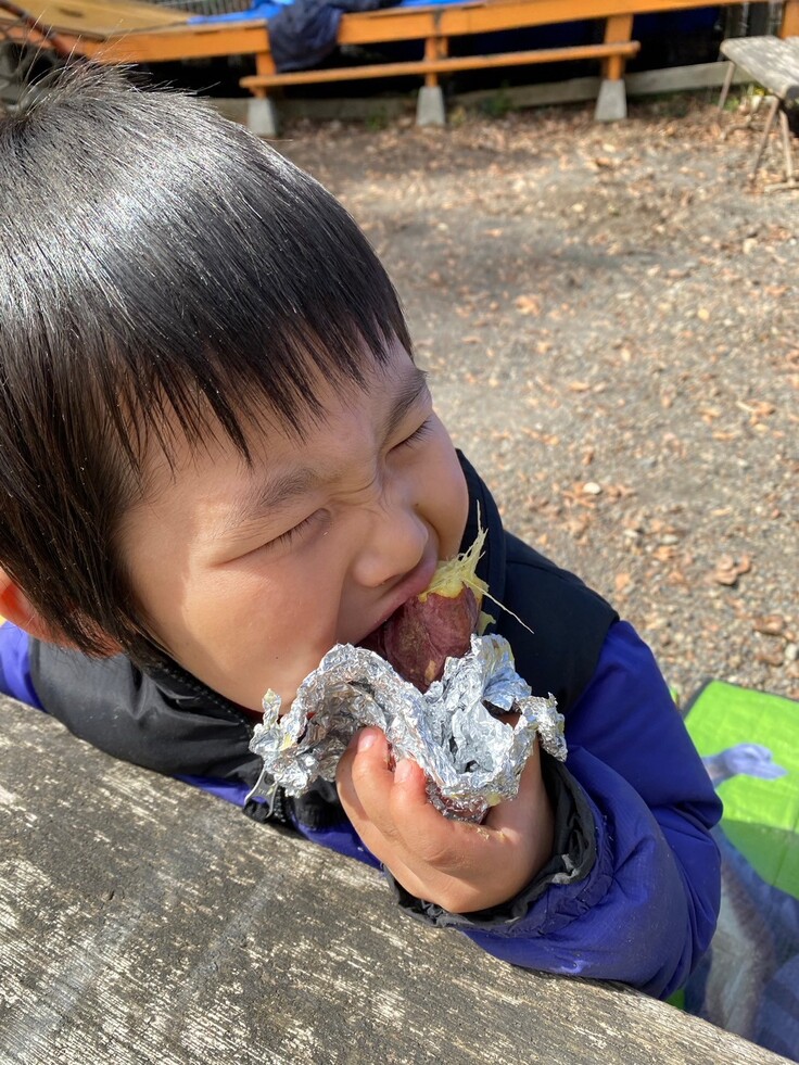 みんなでコツコツ集めた落ち葉で焼く焼き芋は最高においしい!