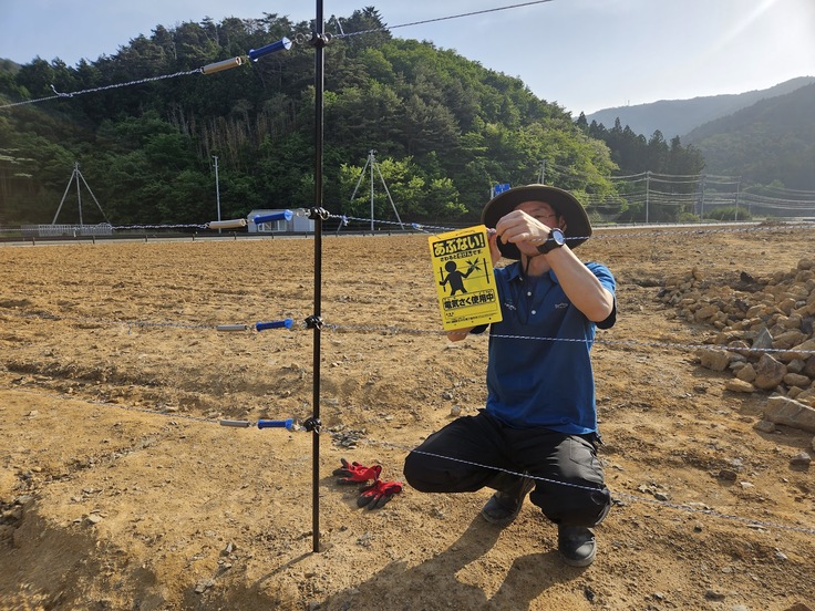 同時並行で進めたのが、電柵。鹿がとても多い雄勝町で畑を鹿などの獣から守ることはとても大事。2.5メートルの支柱を畑の外周約450メートルに立て、3本の電線を張り巡らせました。内側には2メートルのネットも張ることで、小さな動物も入ることができないようにしています。これは番犬としてファームの仲間になることになった犬が抜け出さないためでもあります。